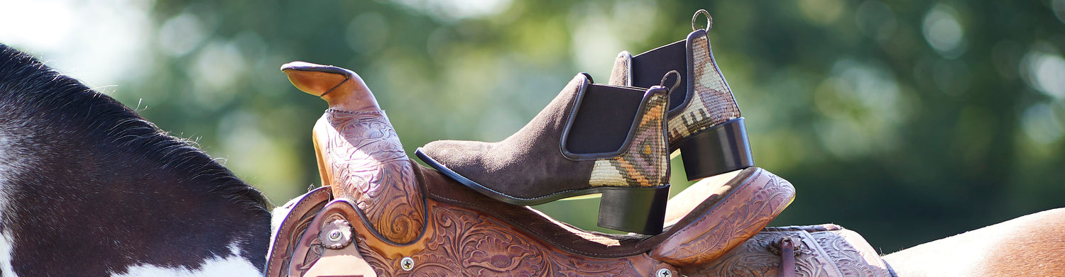 The perfect hybrid between the traditional Jodhpur Boot and Cowboy Boot! Handmade from chocolate suede and antique kilim rugs with a leather sole and a soft leather innersole for comfort, these boots were certainly made for walking. They were designed with a flattering top around the ankle allowing them to look just as great with a pair of skinny jeans or a dress.