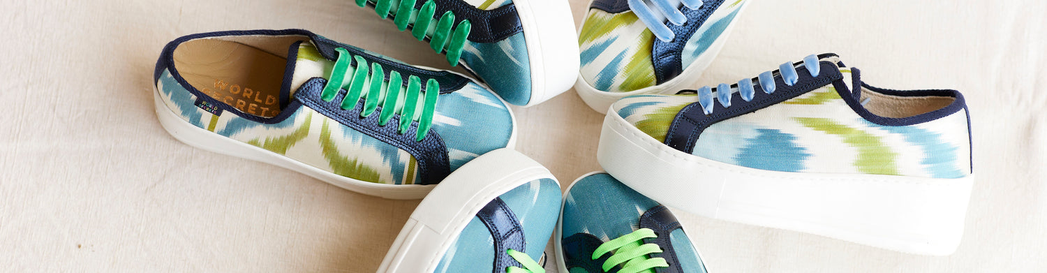 Our High Flyers sneakers are handmade with Ikat silk and have a memory foam innersole making them the comfiest sneakers in all the land! Our classic 'She Who Dares' Sneakers but with a platform, these soles are the right gradient, a flattering height, incredibly lightweight and most importantly, comfortable... the sky's the limit with these sneakers!