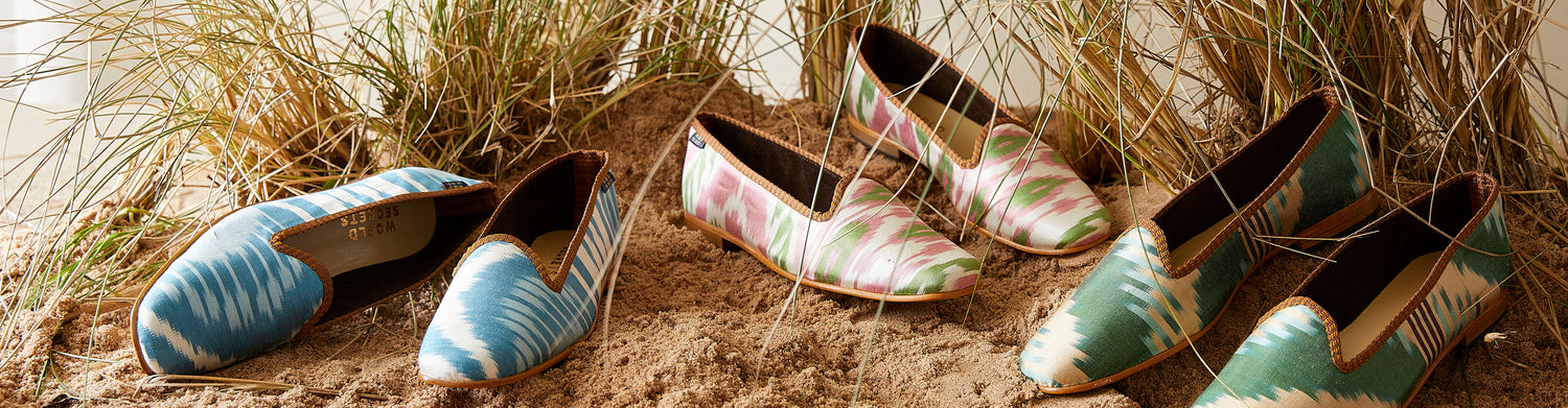 Handmade from limited edition Ikat silks, these shoes were designed to be smart and beautiful without making your feet hurt! ‘No Pain No Gain’ does not apply to these beauties. Our Ikat Shoes are great worn at home, at the beach or a wedding party. A great alternative to a high heel or often worn as an après heel for tired feet, these are a dream to wear with shorts, a skirt or a dress as they are such an elegant shape. Many Brides have worn our Blue Ikat shoes as their ‘Something Blue’, they make great dancing shoes!
