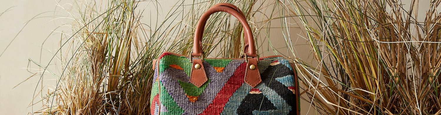 The cutest barrel shaped handbag, handmade from antique kilim rugs which would otherwise be thrown away. Re-used and re-purposed to create a gorgeous every day bag with rolled leather straps and lined with a soft biscuit cotton.
