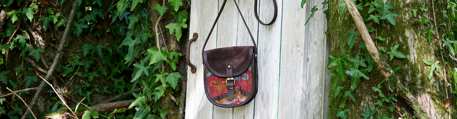 The Mini Saddle Bags are handmade from antique kilim rugs with an adjustable leather cross-body strap, rich chocolate suede details and brass buckle closure. Each one is unique, telling its own story...