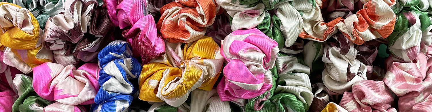 The perfect accessory to match your shoes - these 100% silk scrunchies use up leftover ikat silks to make sure there is no waste when producing our ranges. These look just as fun on your wrist as they do in your hair!