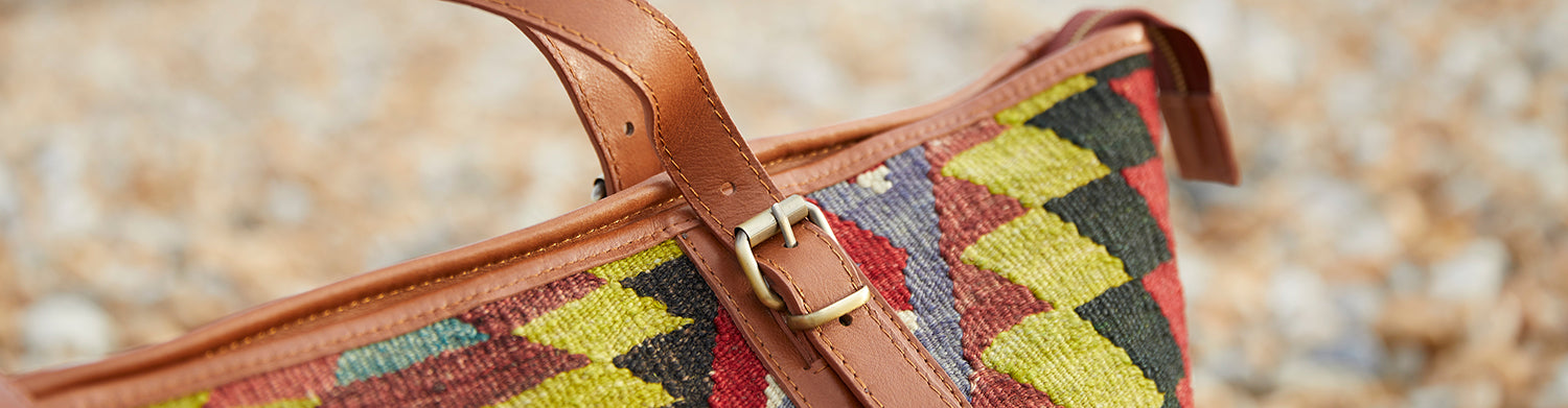 These bags are extremely special. Big enough to carry everything you need for a weekend away, but small enough to fit on a plane as hand luggage. You get to enjoy more of the kilim rug in these larger bags and can appreciate the colours and patterns. Suede lined and made with the softest of leather, these bags are made to last. I like to think that they might get passed down through generations, as they are so beautiful but a classic style.
